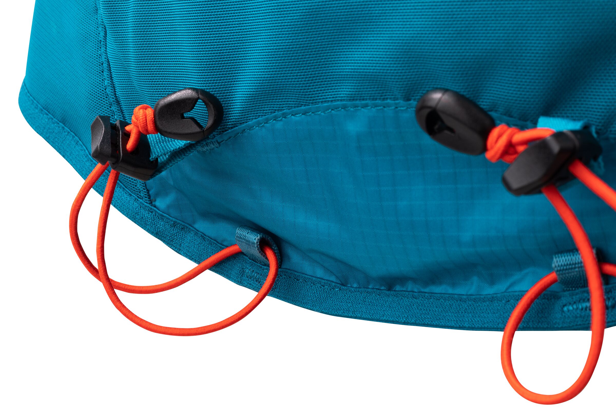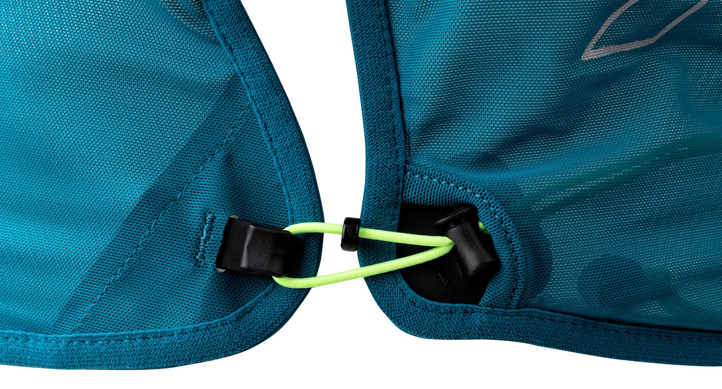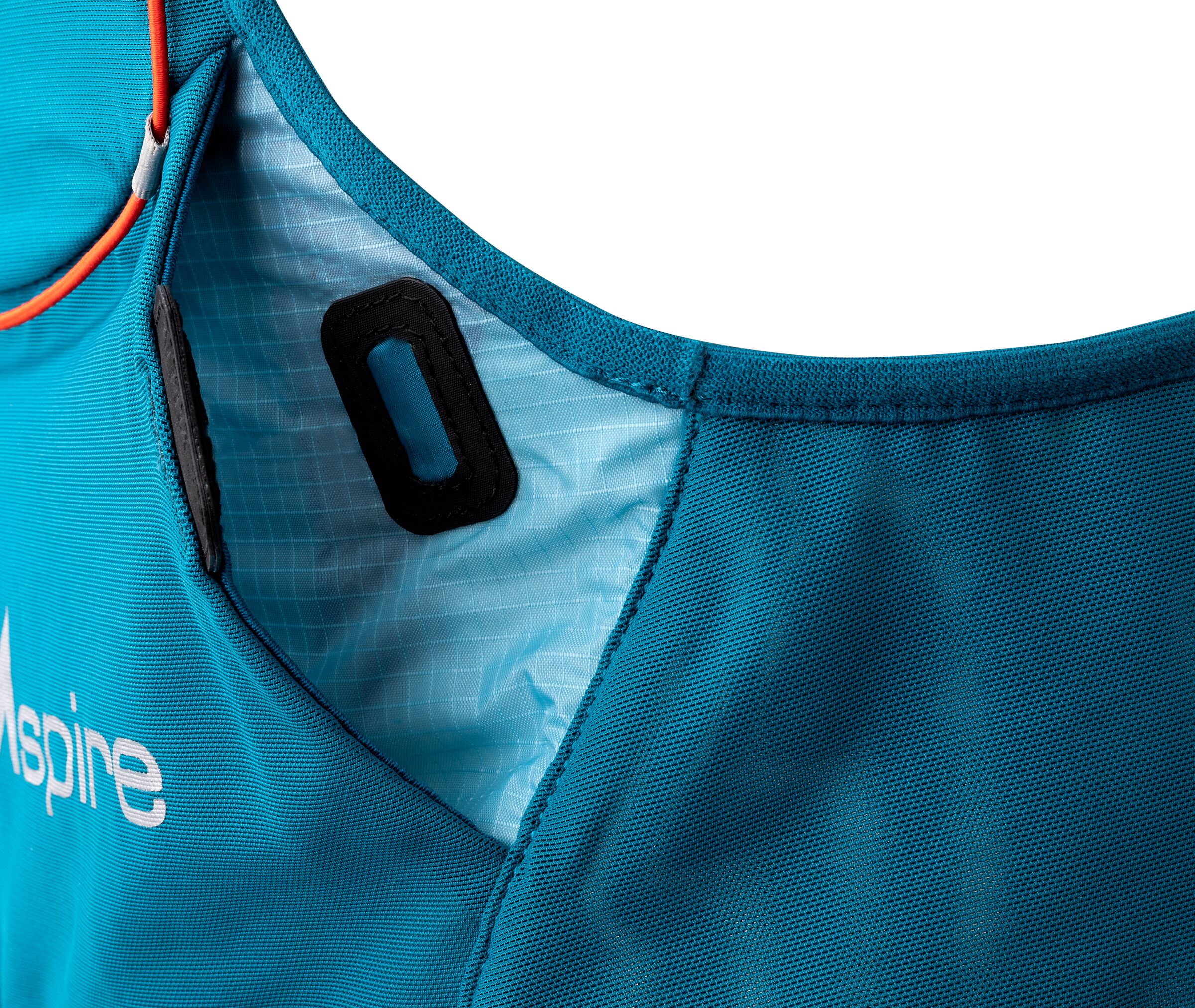 • Shoulder straps: Human shoulders aren’t straight, so a pack’s shoulder straps shouldn’t be either. Longer straps allow the back portion to sit deeper on the neck to prevent any rubbing. This addition in length helps to create slope as the straps come over the top of the shoulders and around the neck following the natural curve of the body. The harness then follows an S curve around the arms and chest area to avoid any hindrance to the running motion.